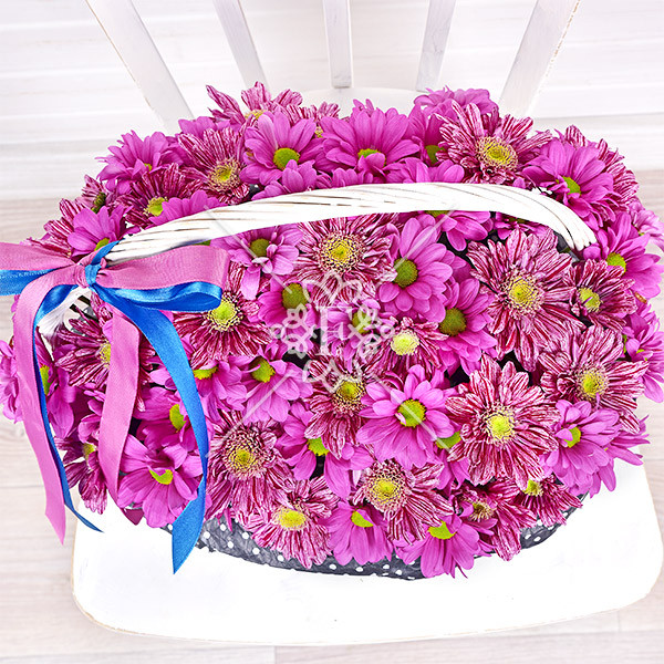 Нежная и яркая, привлекательная и гармоничная композиция из фиолетовых хризантем в плетеной корзинке выглядит  очень мило и заманчиво!
