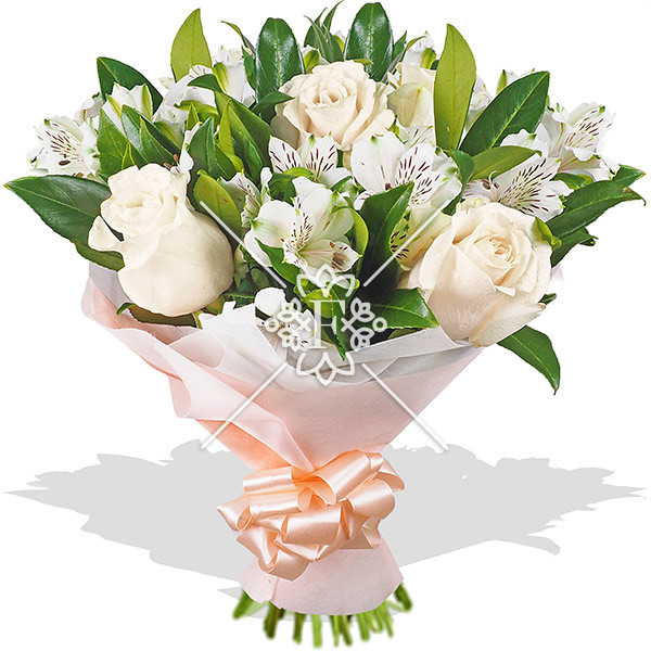 роза белая 3 шт., альстромерия белая 2 шт., зелень декоративная, упаковка, лента.